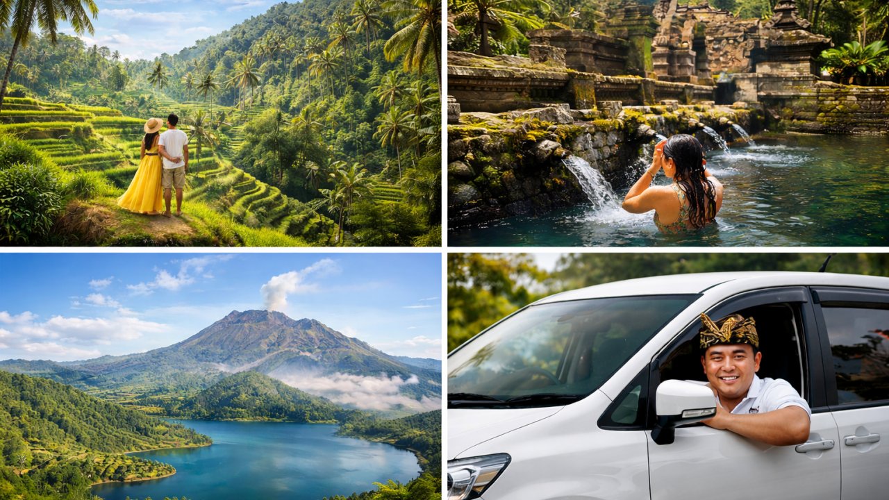 Discover the beauty of Bali in one day with a private tour to Ubud and Kintamani. Enjoy rice terraces, temples, local culture, and stunning views of Mount Batur in a comfortable air-conditioned car with a professional driver.
